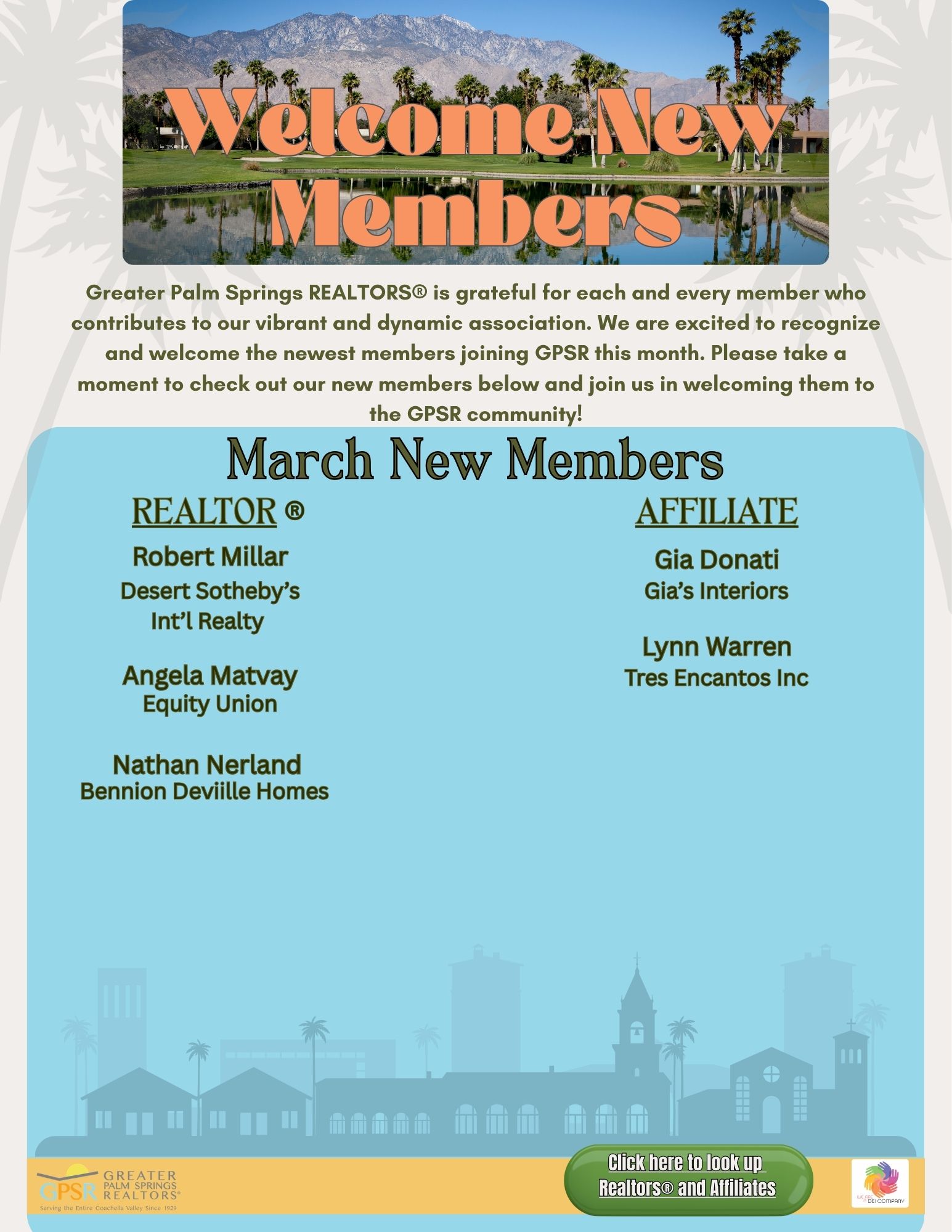 Established in 1929, Greater Palm Springs REALTORS® is an organization for real estate professionals who sell throughout Palm Springs and its neighboring communities, providing member education, networking, MLS services, legislative representation, , access to tools, resources, and industry partners, as well as membership in the California Association of REALTORS® (CAR) and the National Association of REALTORS® (NAR).